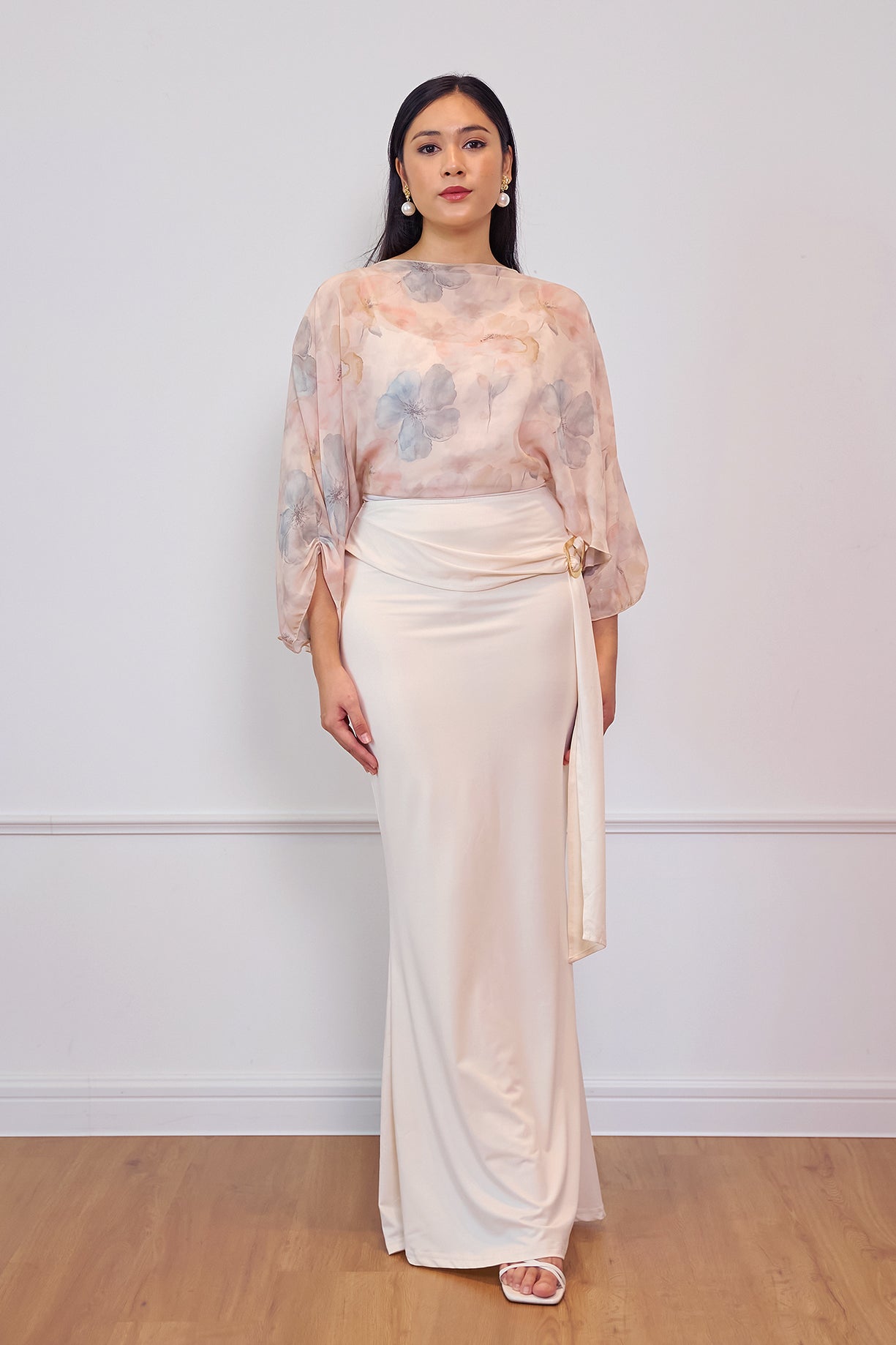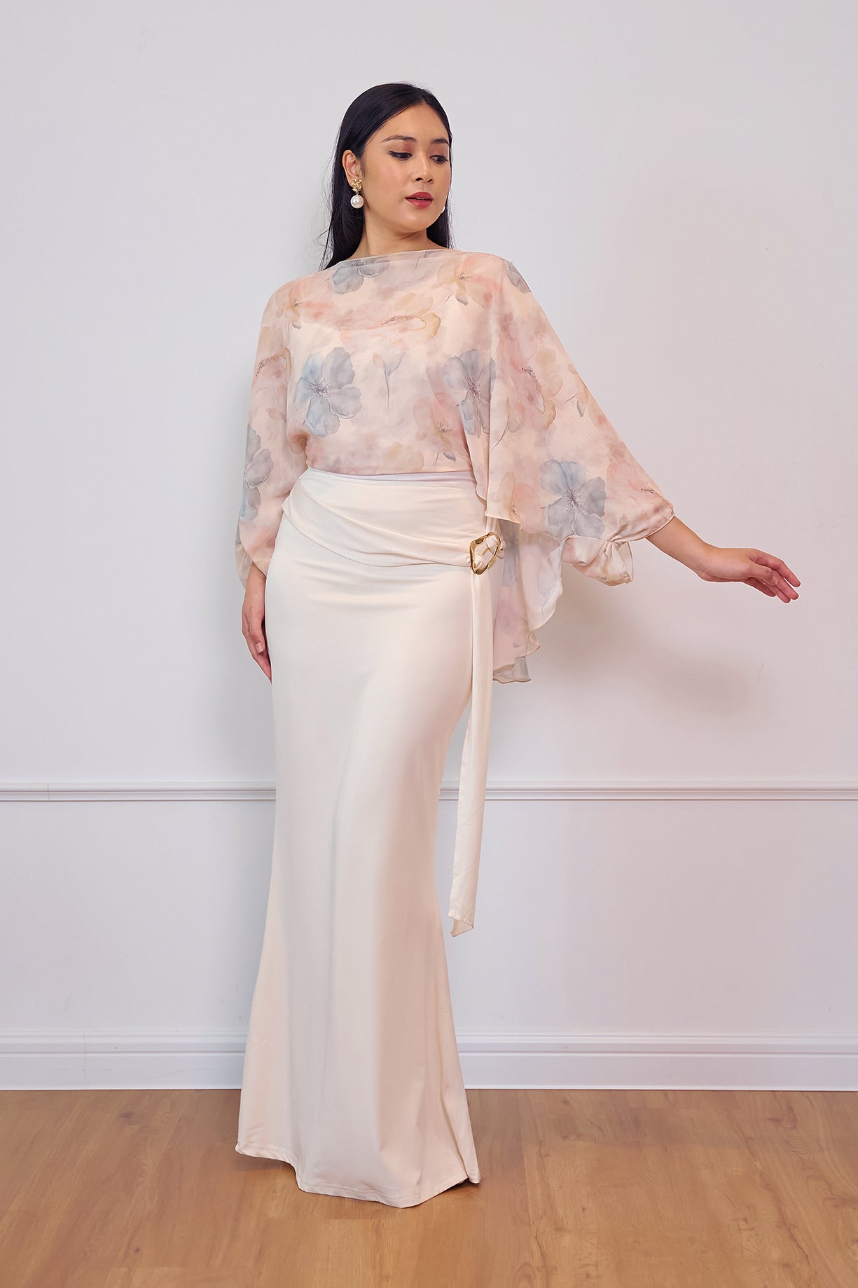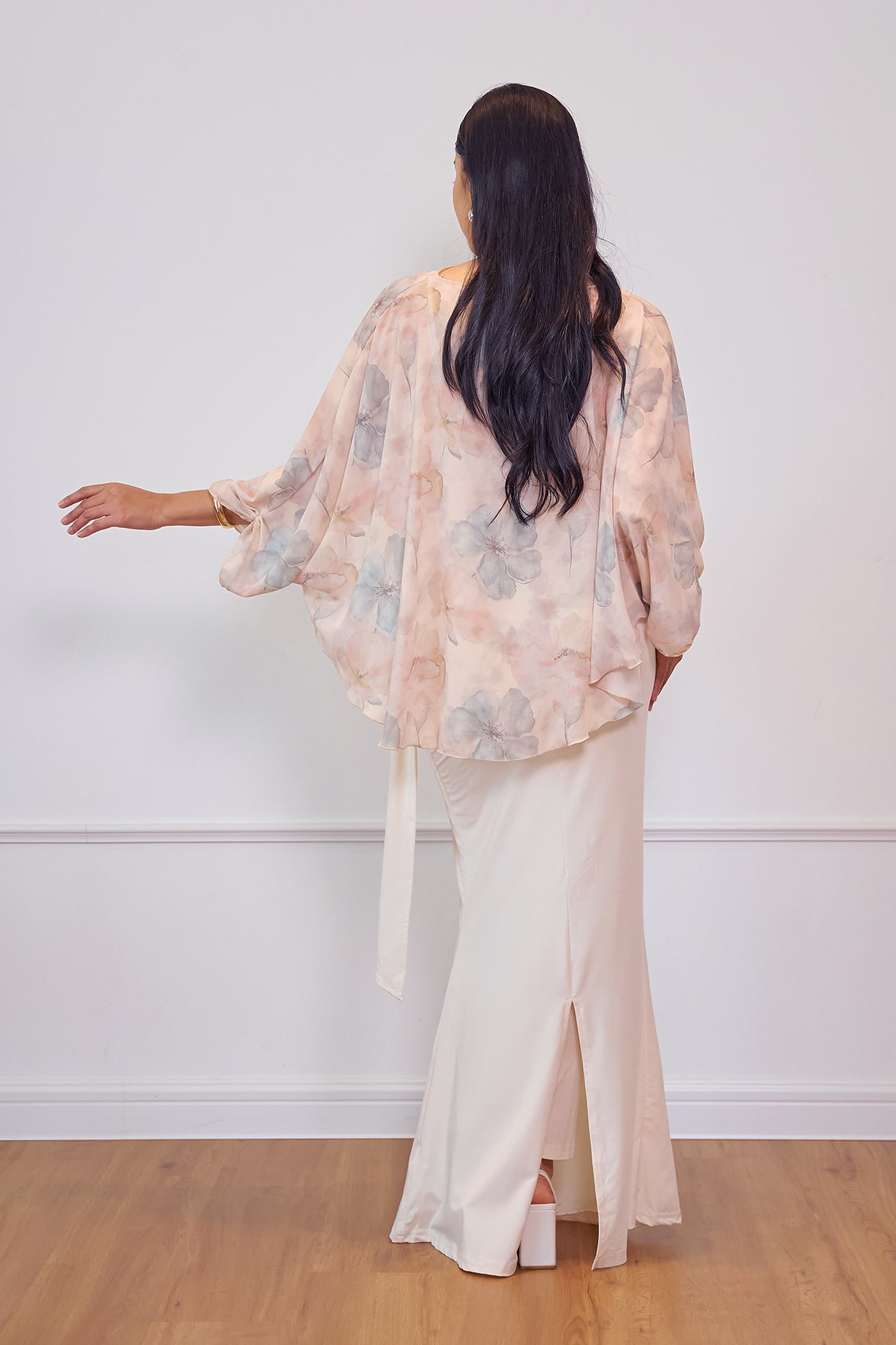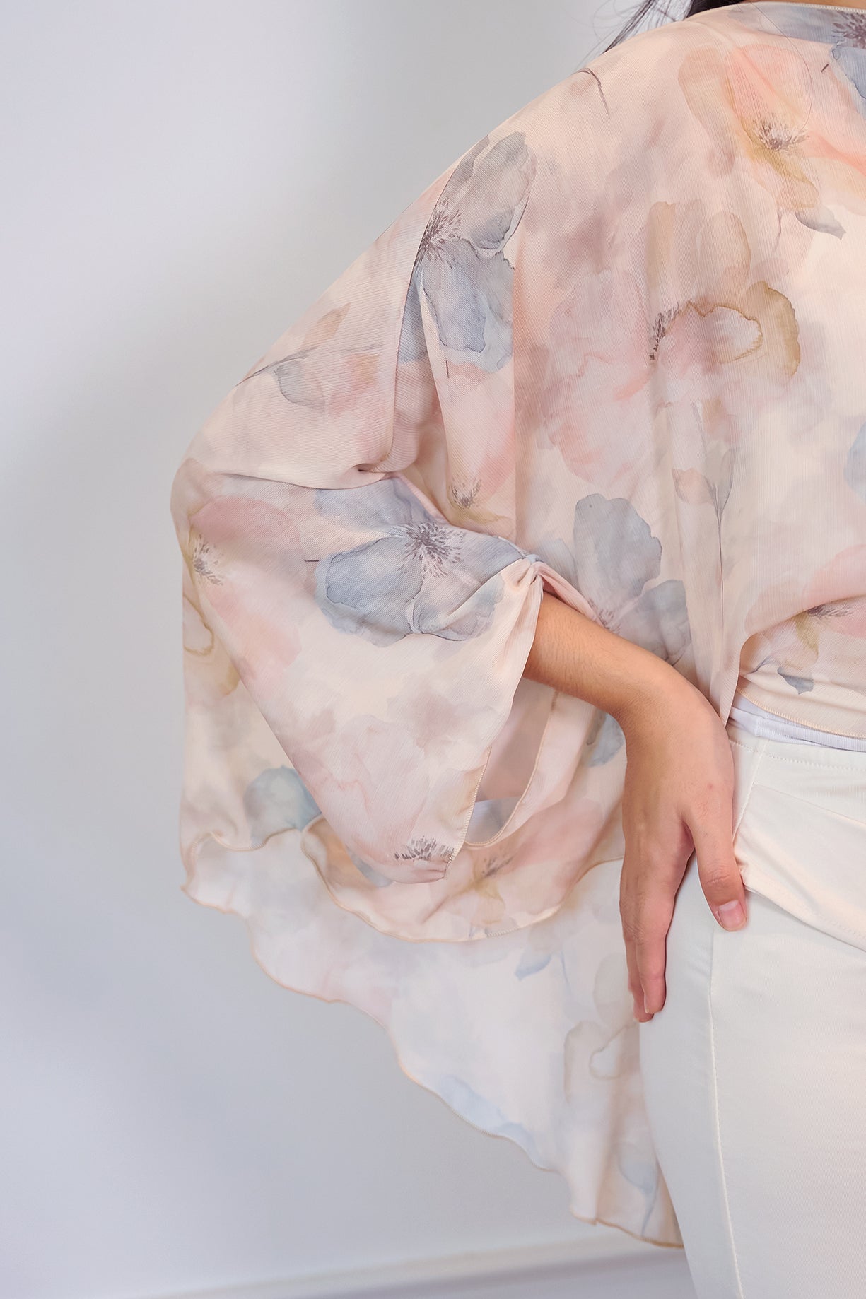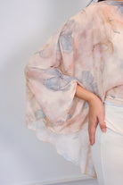 A flowy printed cape designed with a relaxed silhouette for an effortlessly graceful look. Made from lightweight chiffon, it drapes beautifully and adds a soft, feminine touch to any outfit. Perfect for pairing with skirts or tailored pants for an elevated everyday ensemble.
