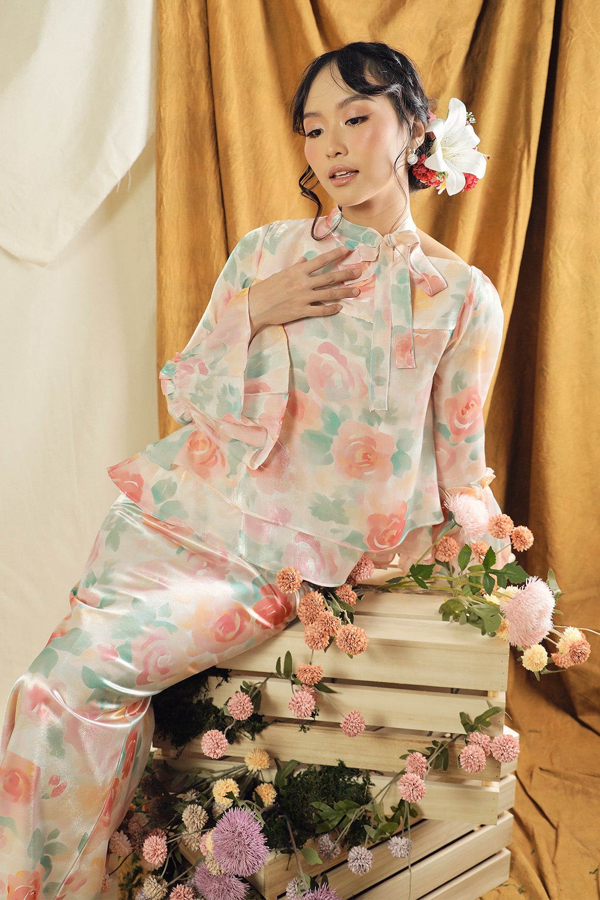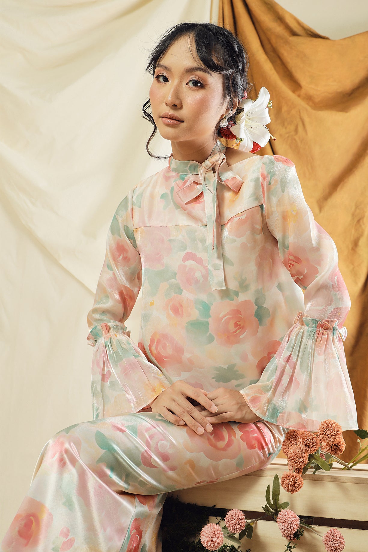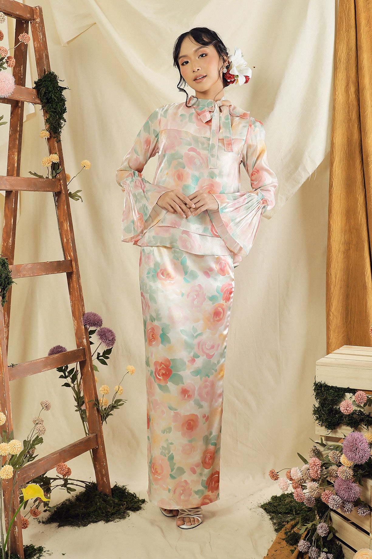 The Rosavelle Kurung is designed with elegance in mind, combining a lightweight, flowy organza top that creates a soft, airy movement with a premium satin bottom for a smooth and refined finish. The combination creates a refined, feminine look that feels timeless yet modern.