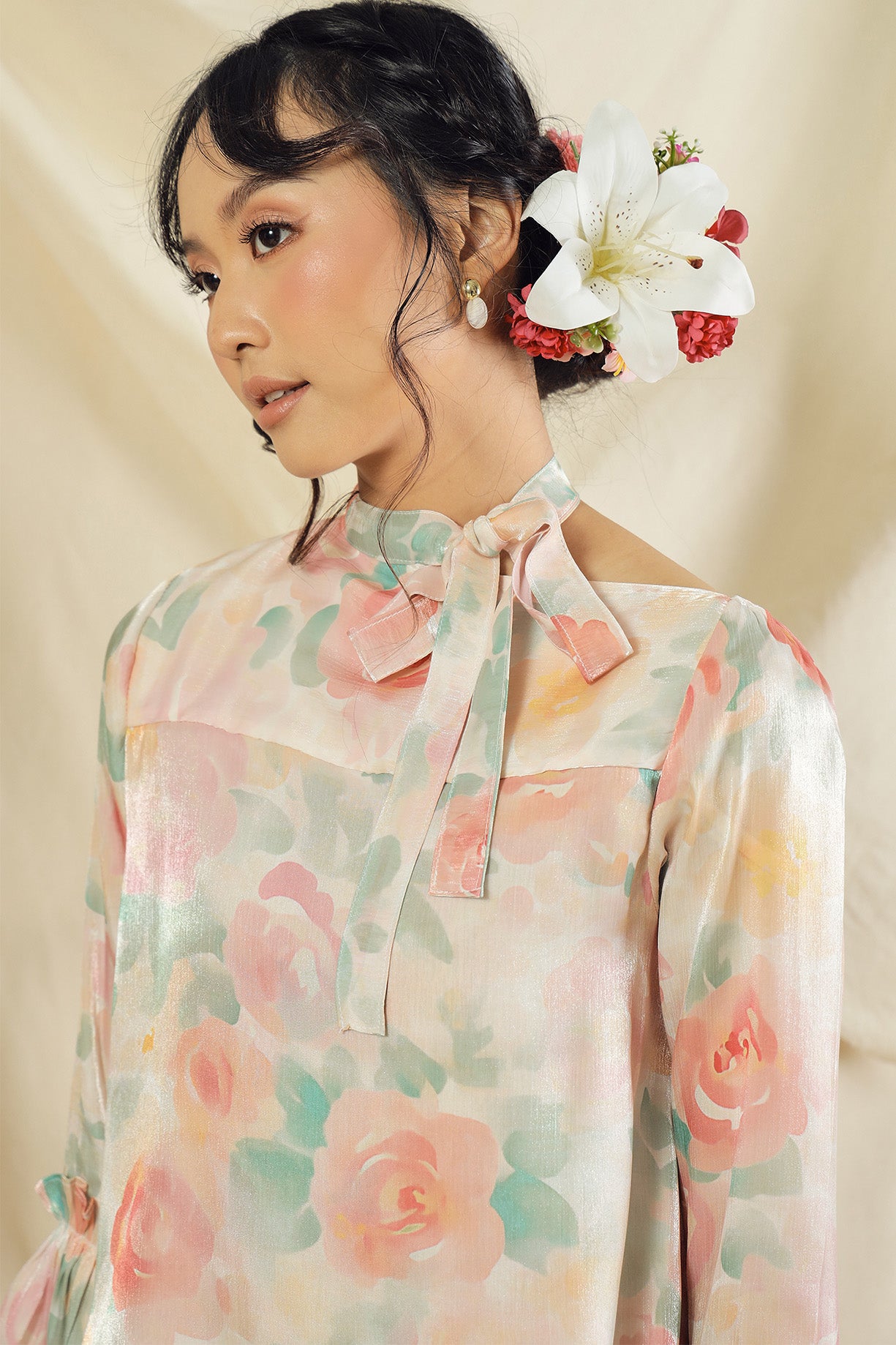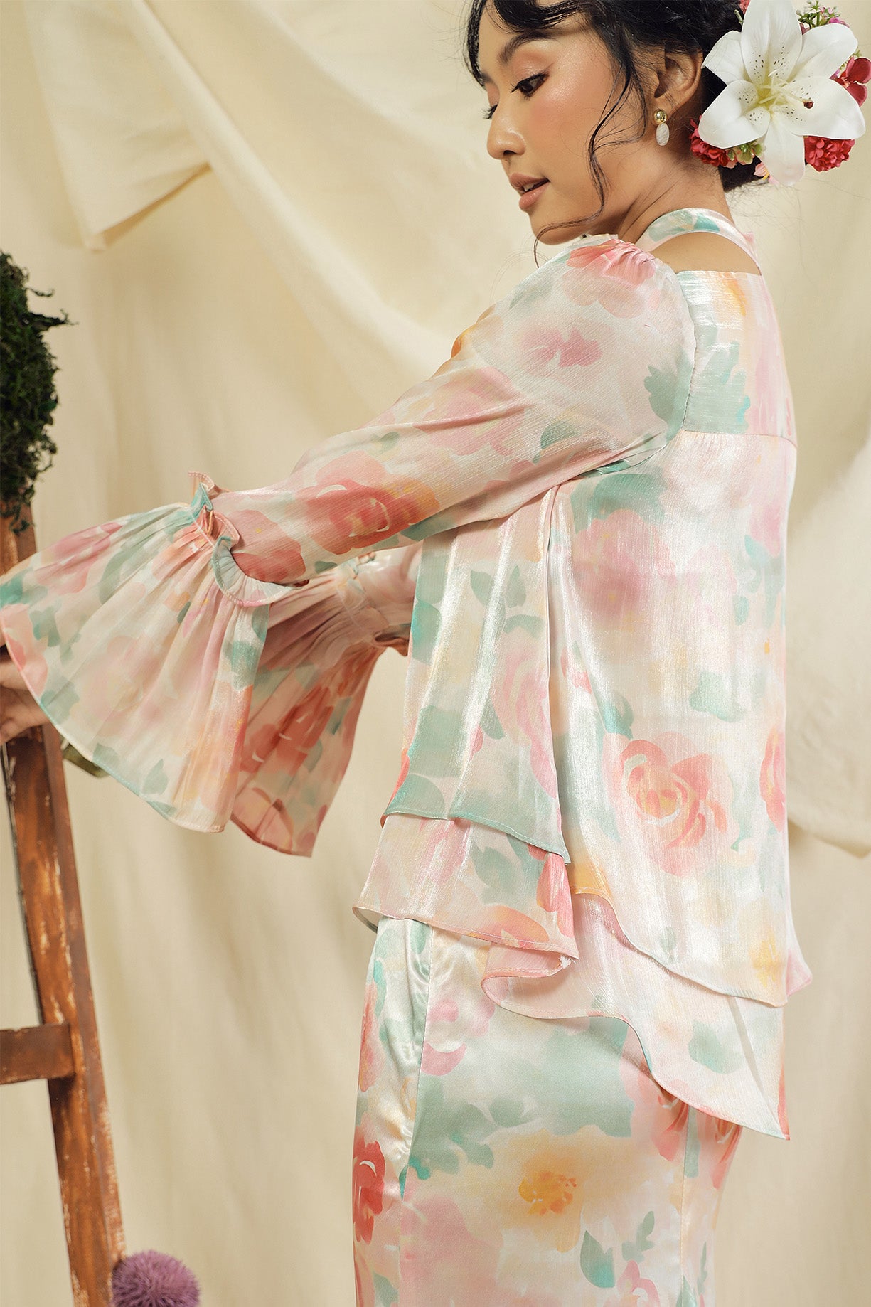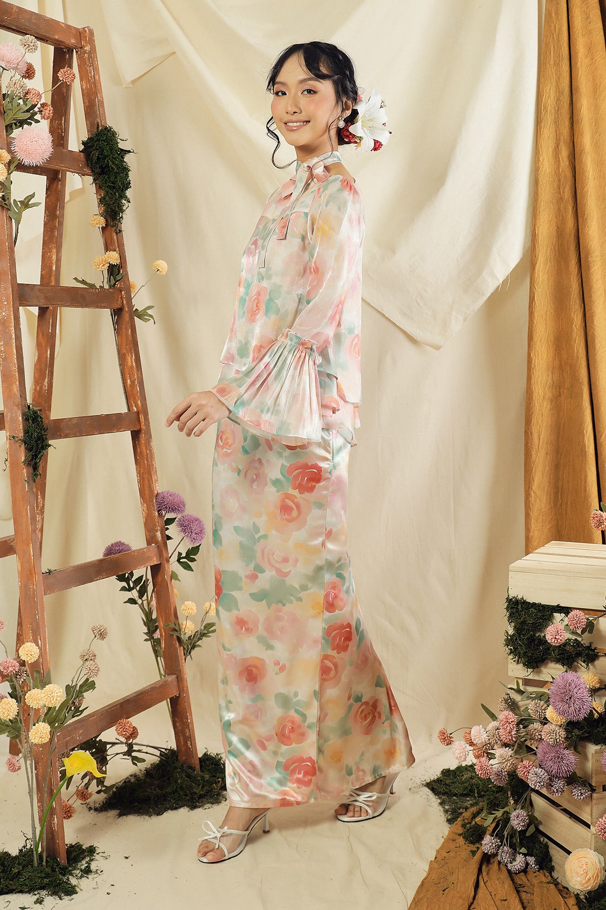The Rosavelle Kurung is designed with elegance in mind, combining a lightweight, flowy organza top that creates a soft, airy movement with a premium satin bottom for a smooth and refined finish. The combination creates a refined, feminine look that feels timeless yet modern.