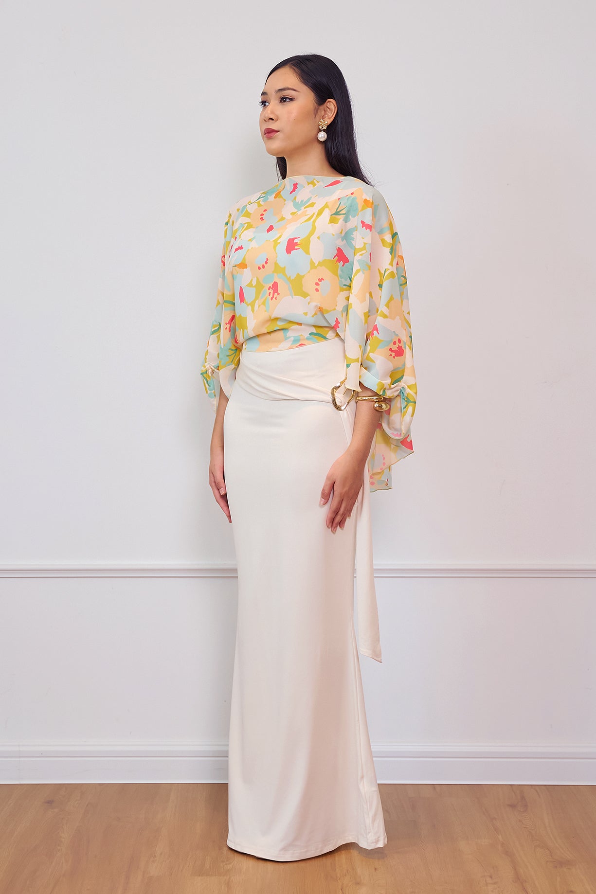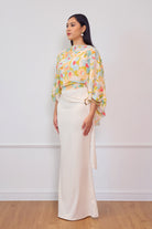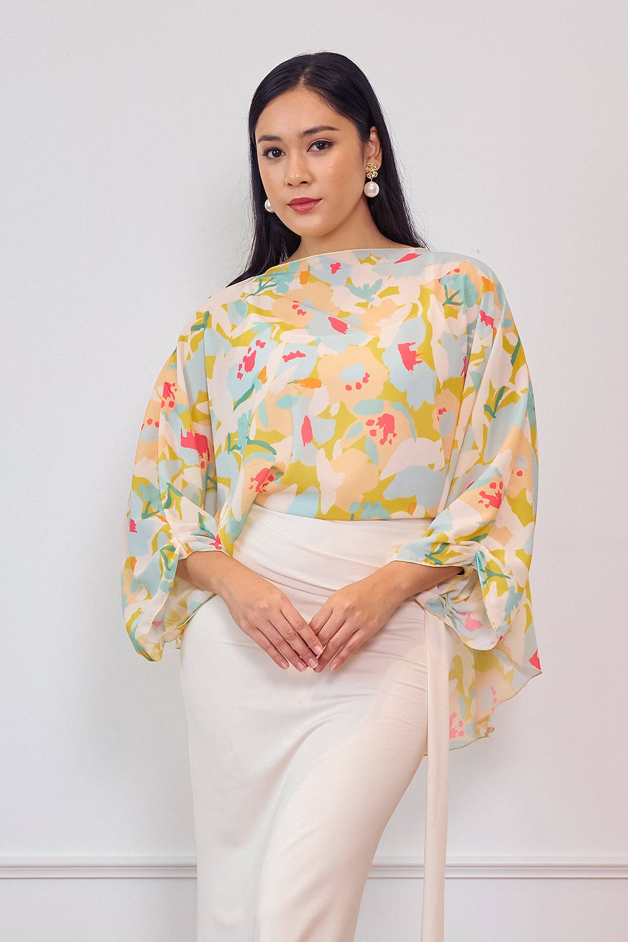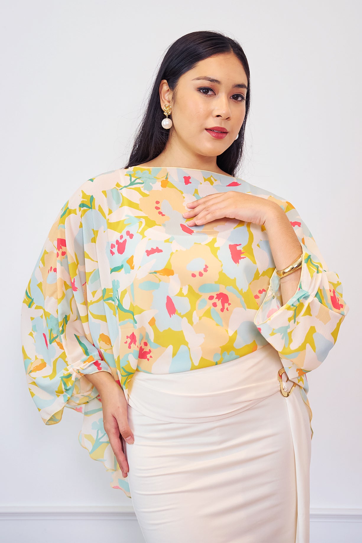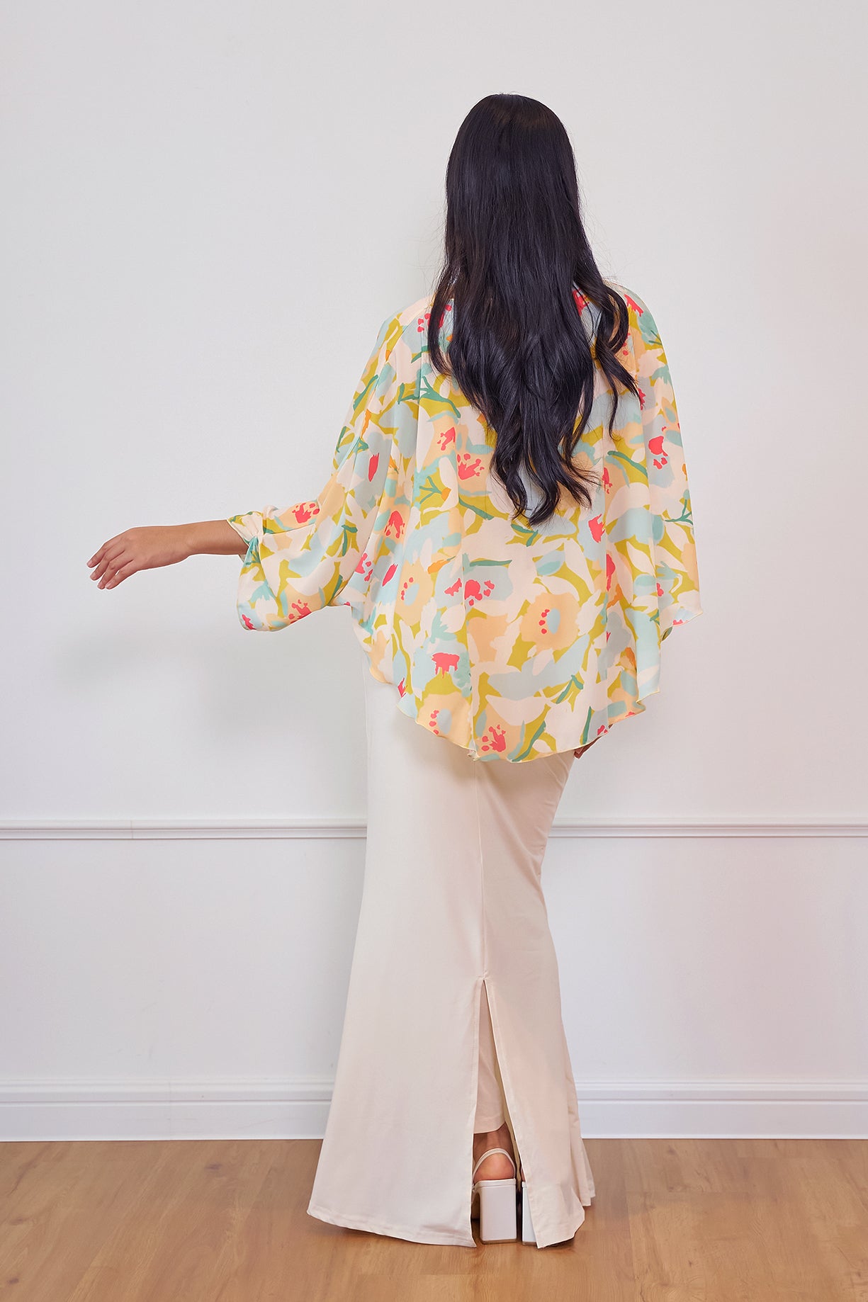 A flowy printed cape designed with a relaxed silhouette for an effortlessly graceful look. Made from lightweight chiffon, it drapes beautifully and adds a soft, feminine touch to any outfit. Perfect for pairing with skirts or tailored pants for an elevated everyday ensemble.